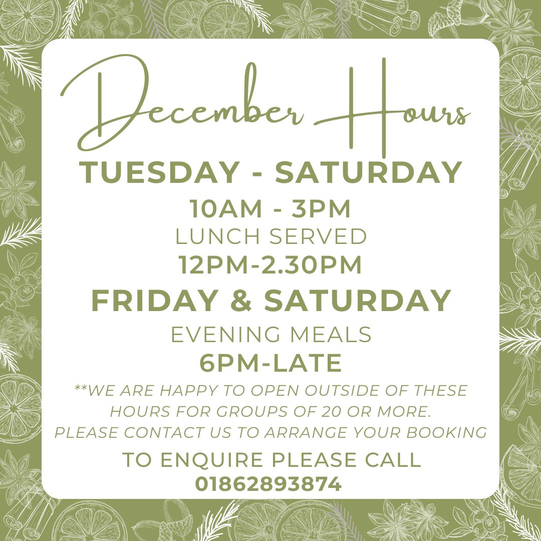 Thurs, Fri – Sat: 10.00am – 3.30pm
